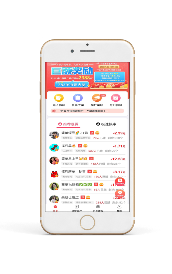 每天动动手指完成悬赏任务即可赚取丰厚利润,每天上万任务等您来做!邀请好友加入,让您不劳而获!